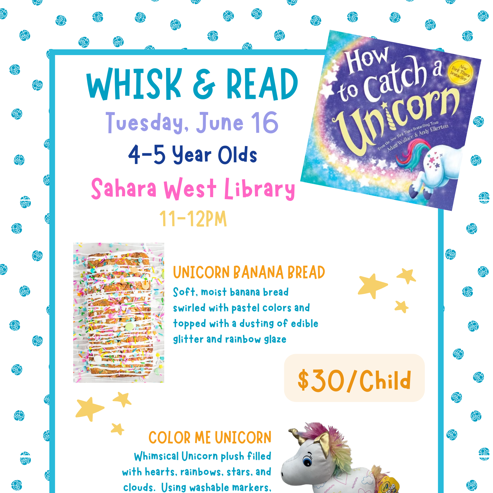 Join us for a whimsical unicorn-themed class where little chefs (ages 4β5) will make colorful Unicorn Banana Bread and decorate their very own cuddly Color Me Unicorn to take home ππ
